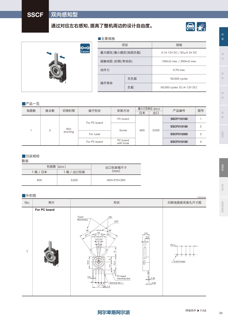 双向输出型 ・ 最大额定值:0.1A 12V DC ・ 动作力:0.7N max. ・ 操作寿命(无负载):50000 cycles。