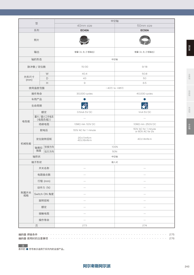 EC40A系列控制轴松动,实现了良好的操作感觉。输出:增量(A B 2相输出) ・ 外形尺寸:40mm size ・ 定位数:30 ・ 脉冲数(位置数):15 ・ 操作寿命:30000 cycles ・ 最大额定值:0.5mA 5V DC。