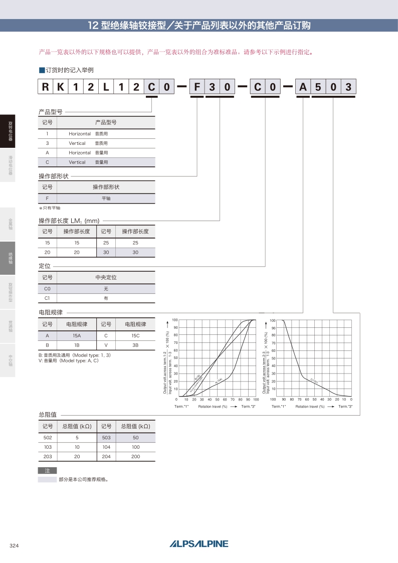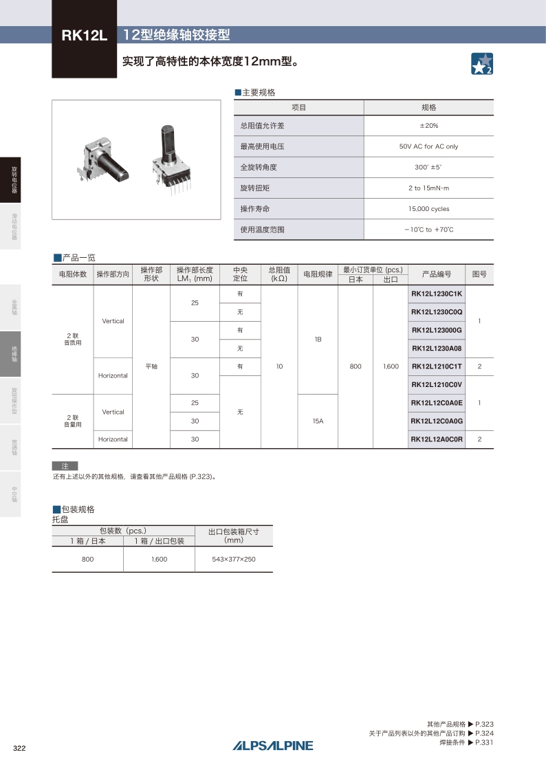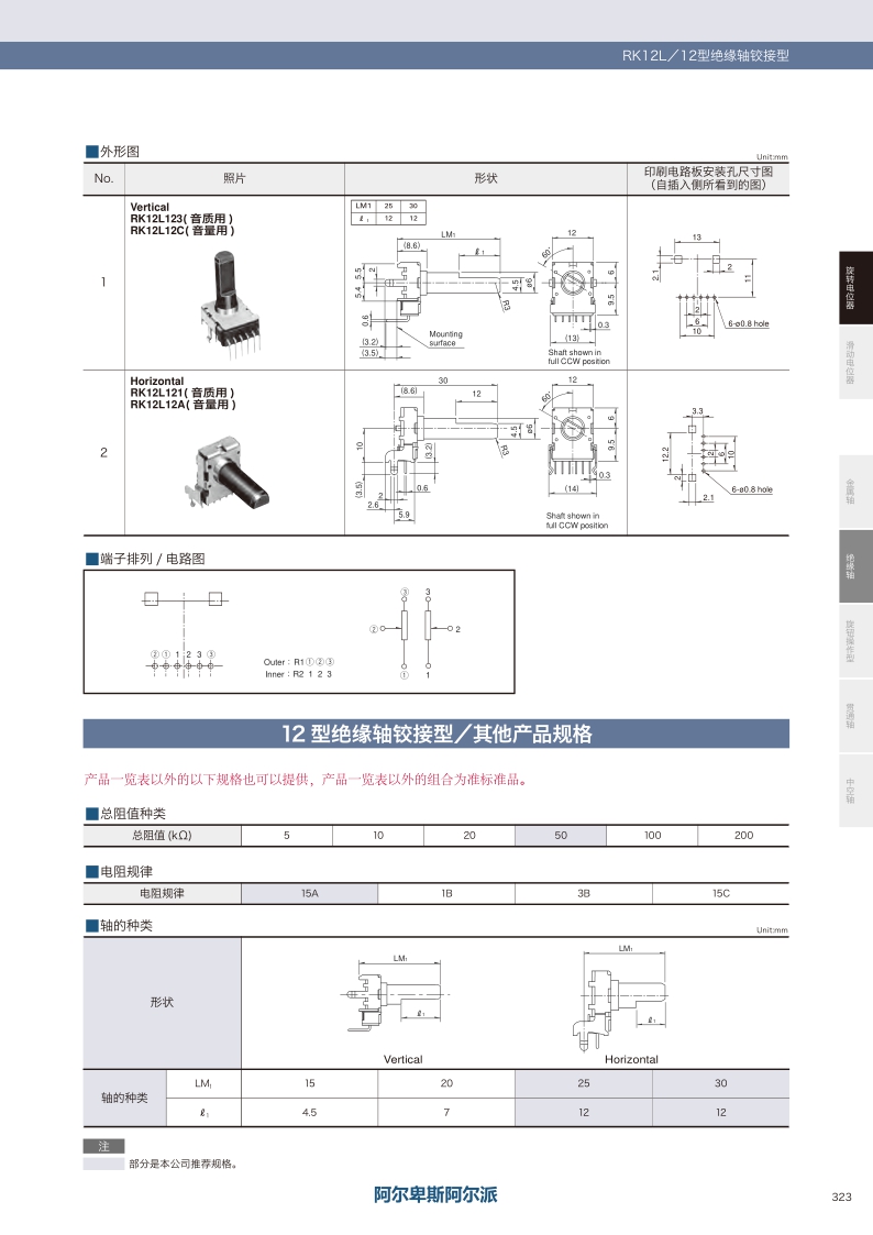 RK12L系列实现了高特性的本体宽度12mm型。型:绝缘轴铰接 ・ 外形尺寸:12型 ・ 电阻体数:2联 ・ 附属开关:无。