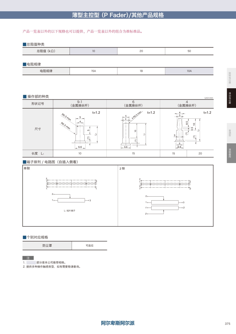 产品编号 照片 电阻体数 安装方向 行程 操作部形状 操作部长度 总阻值 电阻规律