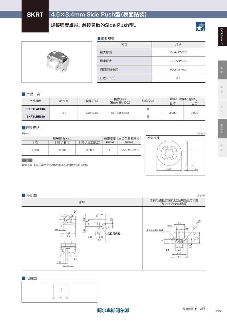 SKRTLAE010 照片 Surface mount 1.6N Side push 0.2mm 3.3mm 100,000 cycles 500mΩ max. 4.5×3.4×3.3
