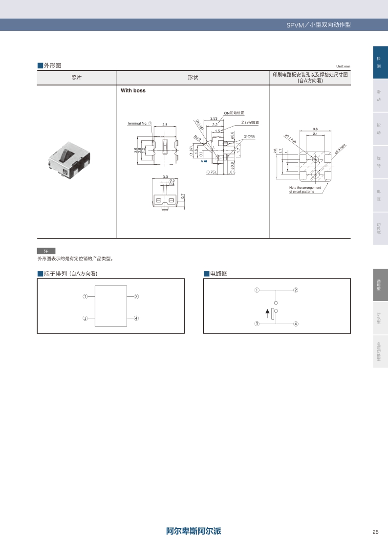 立式 / 小型双向动作型 ・ 最大额定值:1mA 5V DC ・ 动作力:0.4N max. ・ 操作寿命(无负载):50000 cycles。