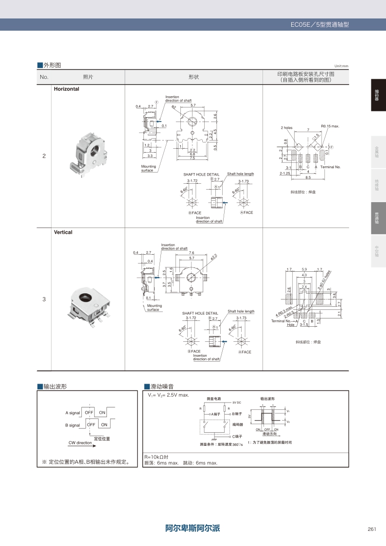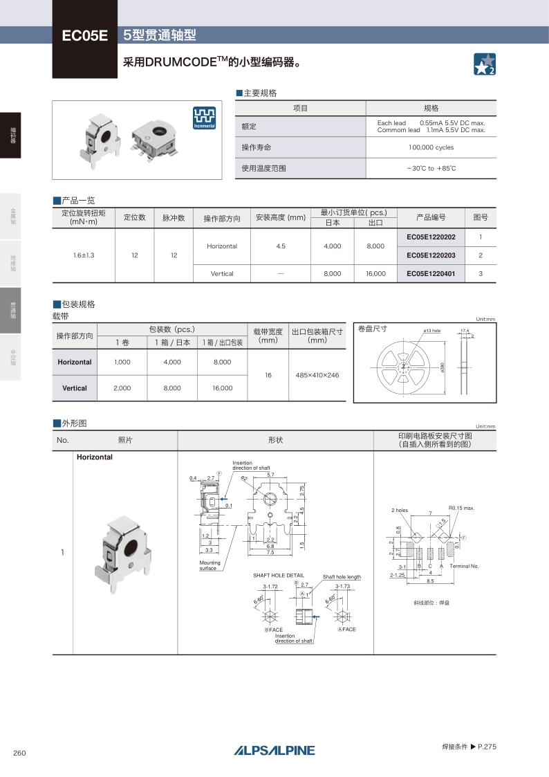 采用 DRUMCODE™的小型编码器,输出:增量(A B 2相输出) ・ 外形尺寸:5mm size ・ 定位数:12 ・ 脉冲数(位置数):12 ・ 操作寿命:100000 cycles ・ 最大额定值:0.55mA 5.5V DC。