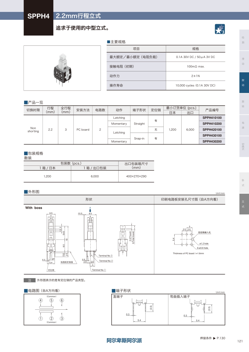 SPPH420100 照片 Non shorting 2.2mm 3.0mm 2±1N PC board 2 Latching Straight 8.5×6.5×8.5mm