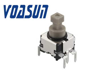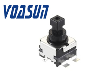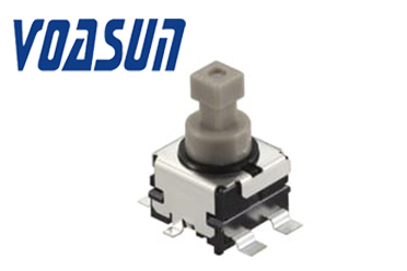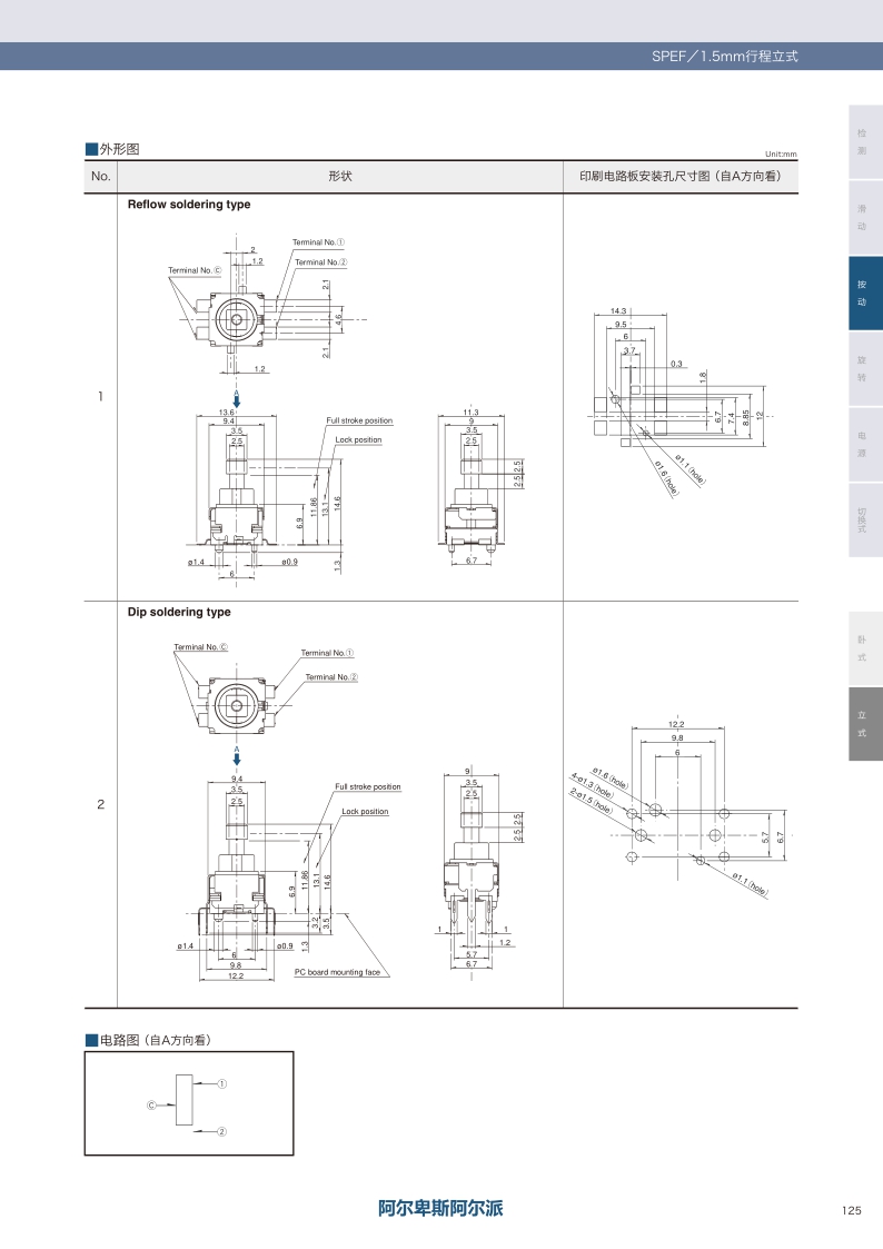 实现无铅焊接表面贴装的按动开关。操作方向:Vertical ・ 最大额定值:1A 14.5V DC ・ 行程:1.5mm ・ 电路数:1-pole。