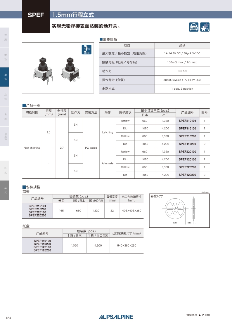 SPEF210101 照片 Non shorting 1.5mm 2.7mm 3N PC board 1 2 Latching Reflow 9.4×9.0×6.9mm