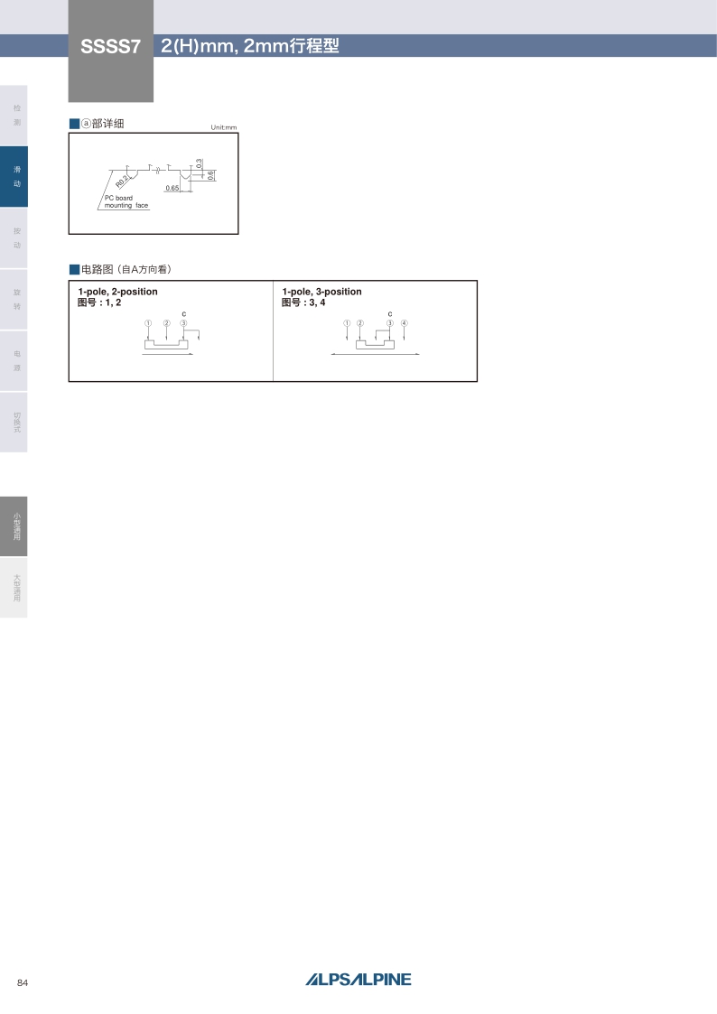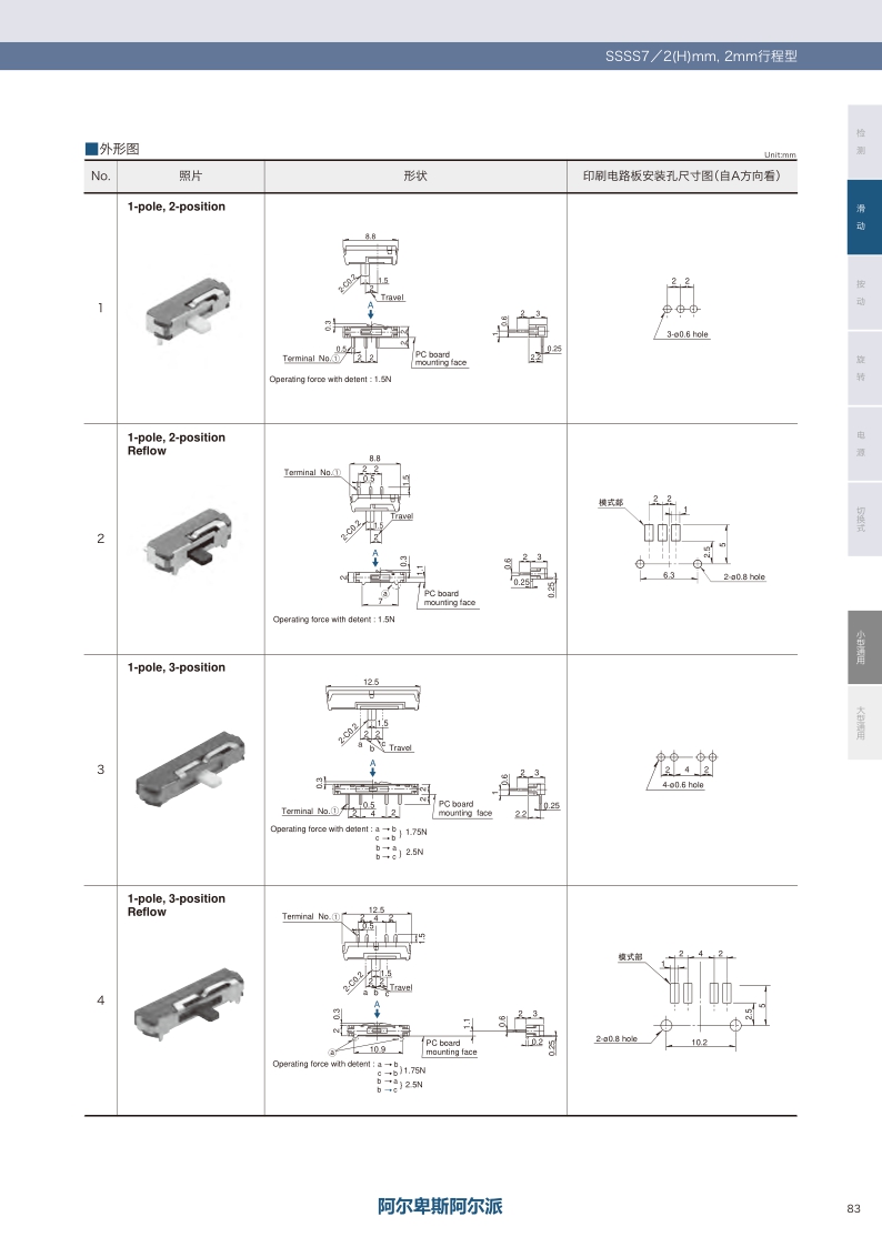 产品编号 照片 行程 操作部方向 操作部长度 电路数 接点数 动作力 切换时限 焊接方法 操作 尺寸(W×D×H)