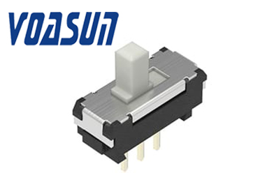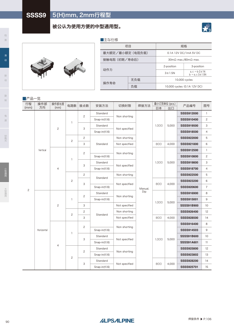 使用方便的中型通用型滑动开关,操作方向:Vertical Horizontal ・ 安装高度:5.0mm ・ 行程:2.0mm ・ 最大额定值:0.1A 12V DC ・ 电路数:1/2-poles。