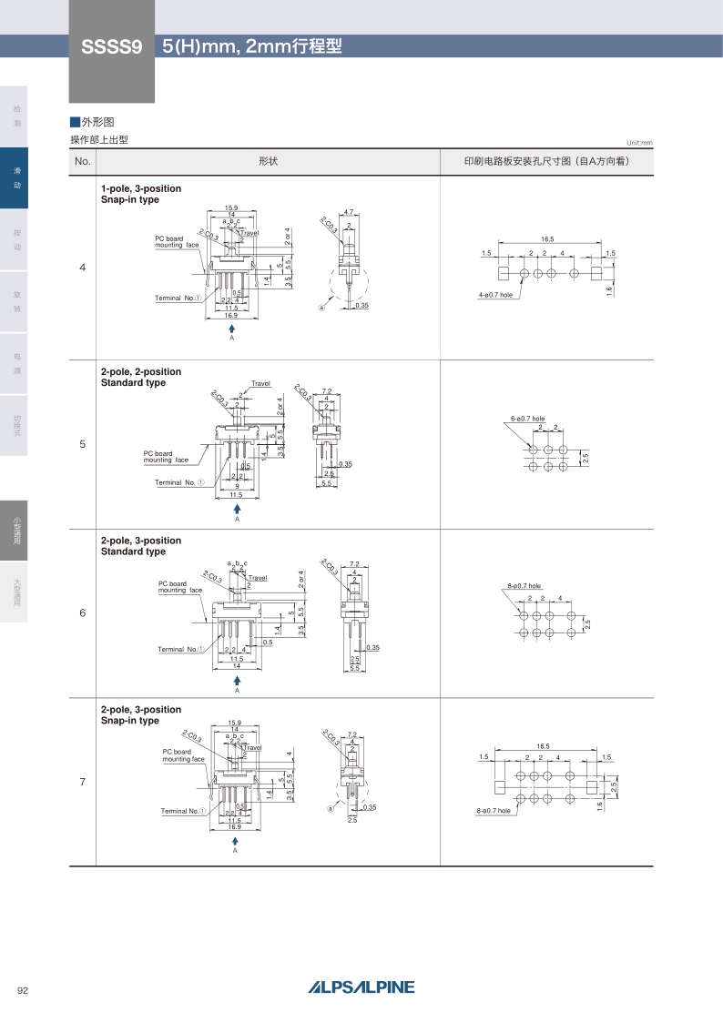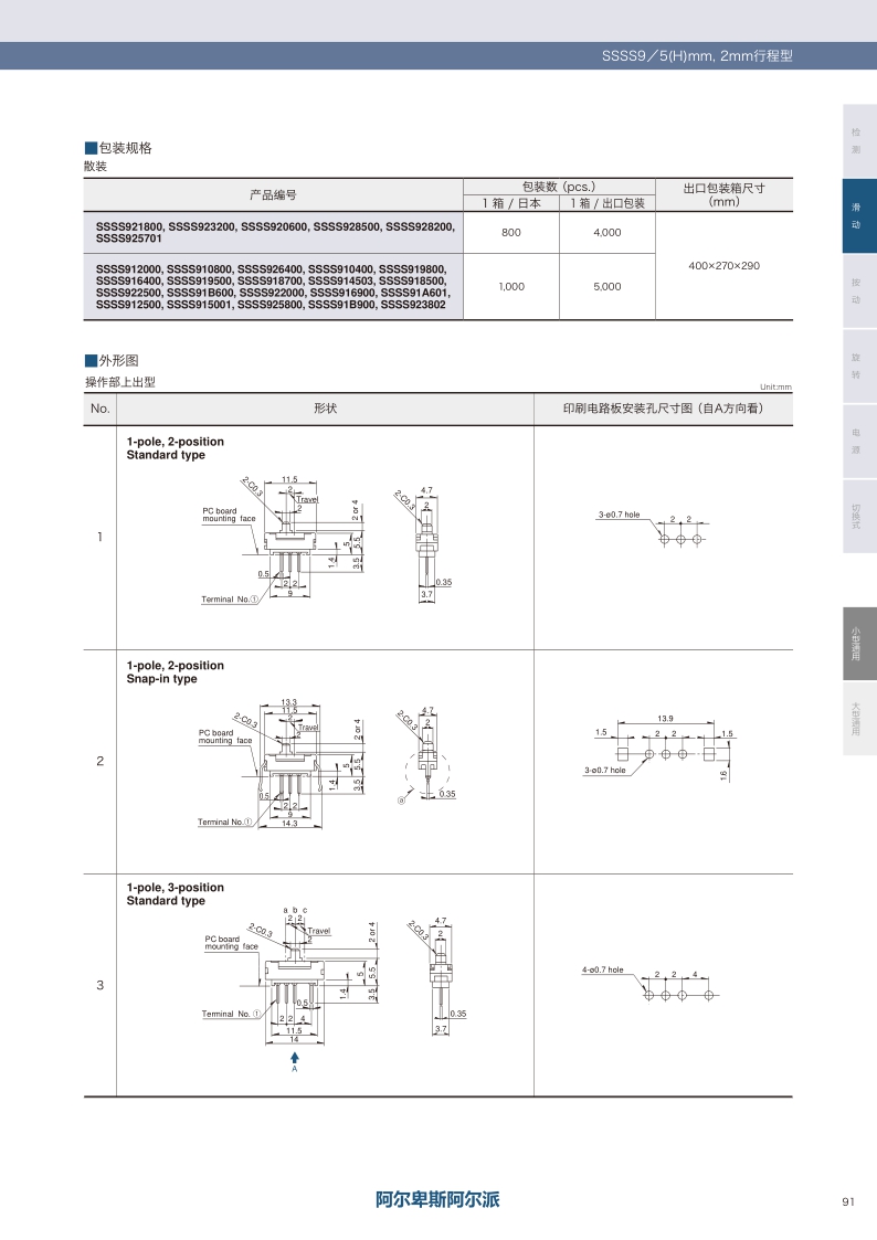 产品编号 照片 行程 操作部方向 操作部长度 电路数 接点数 动作力 安装方法 切换时限 焊接方法 尺寸(W×D×H)