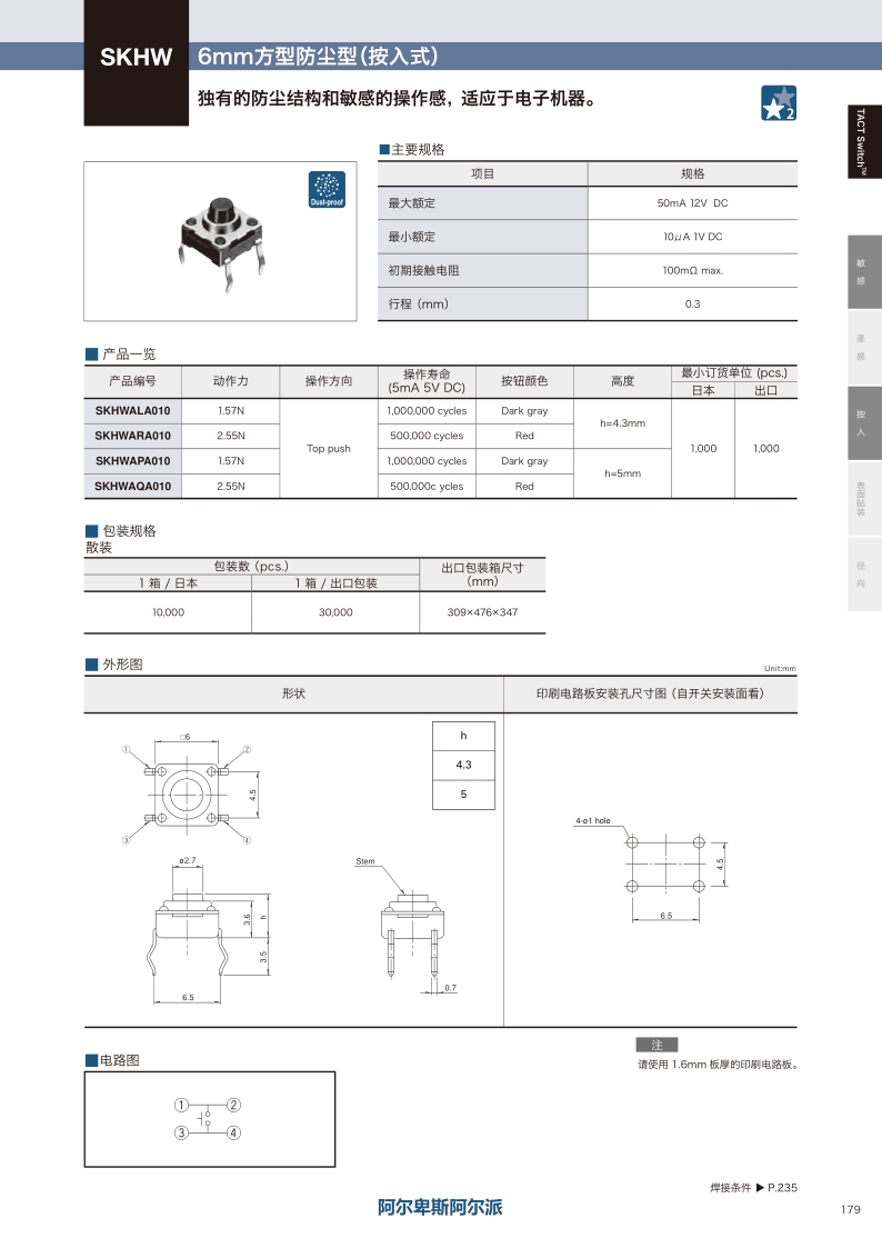 独有的防尘结构和敏感的操作感 适应于电子机器。操作感觉:敏感 ・ 贴装方式:按入 ・ 尺寸(W×D×H):□6.0×4.3/5.0mm ・ 特长:防尘型。