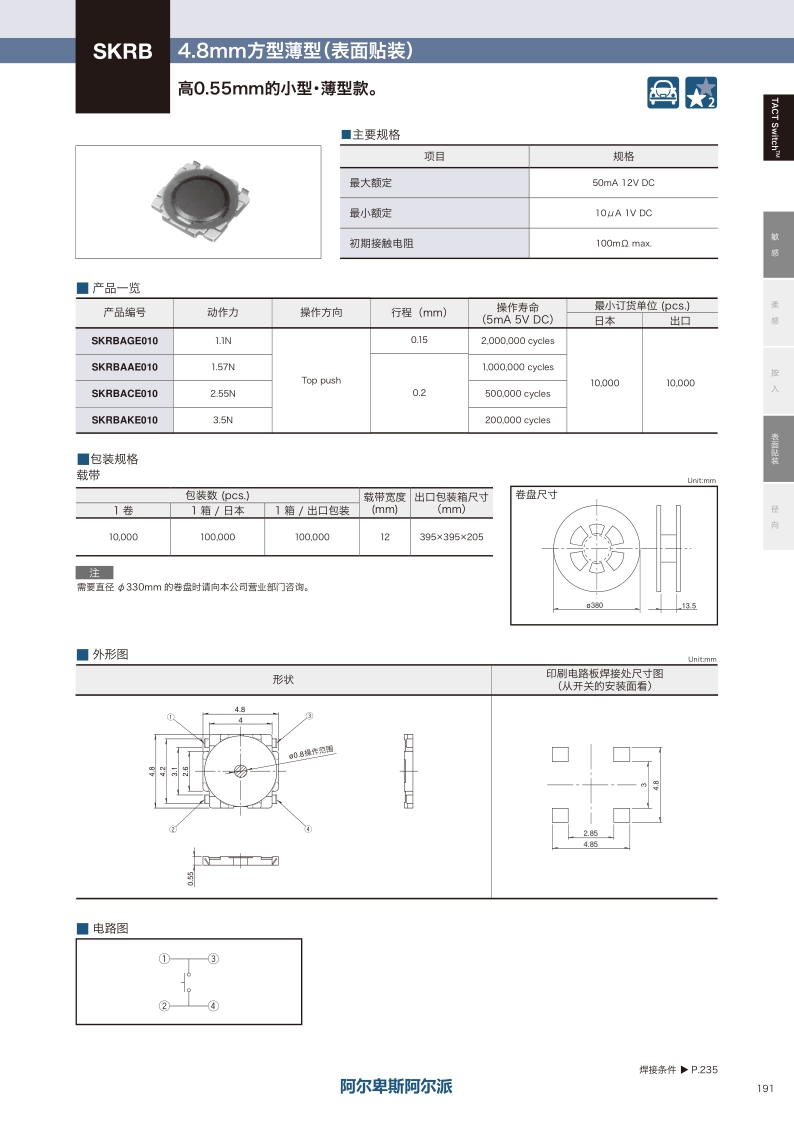 SKRBAAE010 照片 Surface mount 1.57N Top push 0.2mm 0.55mm 1,000,000 cycles 100mΩ max. 4.8×4.8×0.55