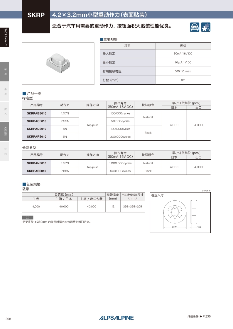 SKRPABE010 照片 Surface mount 1.57N Top push 0.2mm 2.5mm 100,000 cycles 500mΩ max. Natural 4.2 x 3.2×2.5