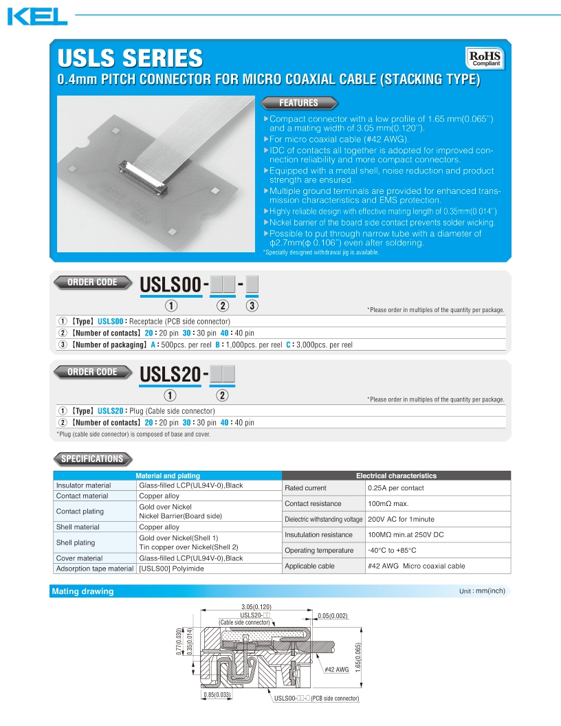 USLS系列采用0.4mm间距设计,压接连接器,超细同轴电缆(AWG#42)型,堆叠连接类型,受体(底板侧连接器)。